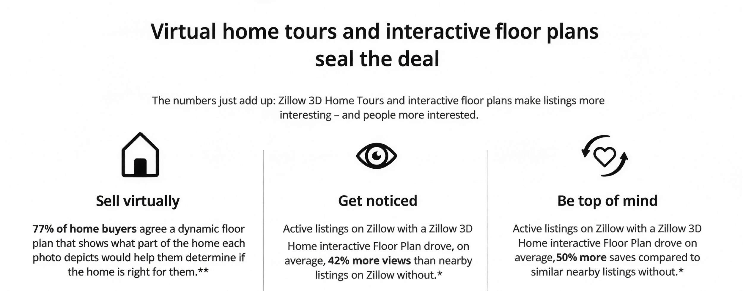 Book a Zillow 3D Tour + Interactive Floor Plan package today and give buyers the virtual experience they expect and sellers the results they deserve.