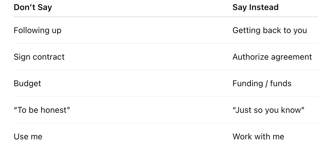Consider this: if a potential client hears “We need to sign a contract today”, they may bristle—feeling rushed or pressured. But if you say, “Once you’re ready, we can authorize the agreement,” the same idea becomes collaborative.