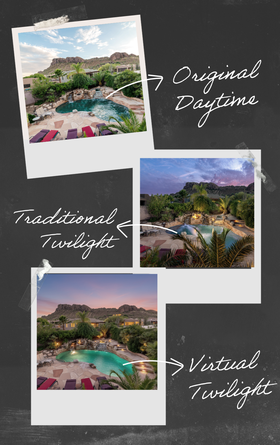 Many Arizona Realtors use virtual twilight as a way to enhance MLS photos without the extra time commitment. For example, a $350,000 listing in Gilbert might not justify the cost of a full twilight shoot, but virtual twilight can still add that upscale appeal to make the property pop online.